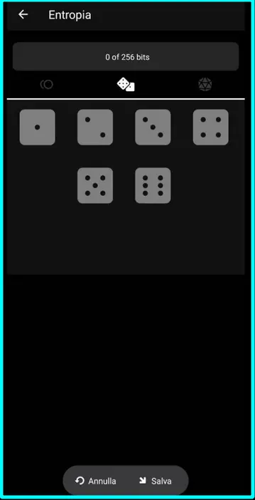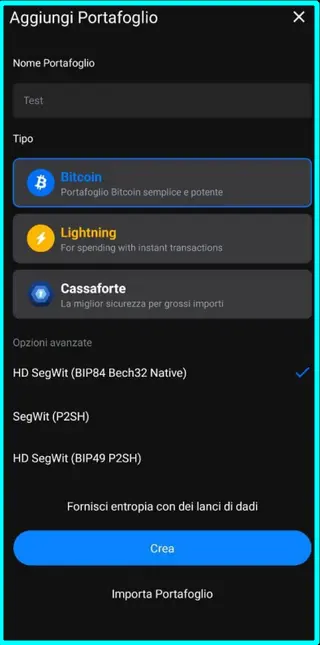 (Opzione per utenti avanzati: BlueWallet supporta la possibilità di creare l’entropia del wallet manualmente attraverso il lancio di dadi o di una moneta. In questo caso generare 256 bit di entropia e successivamente cliccare su Salva. Infine cliccare Crea).