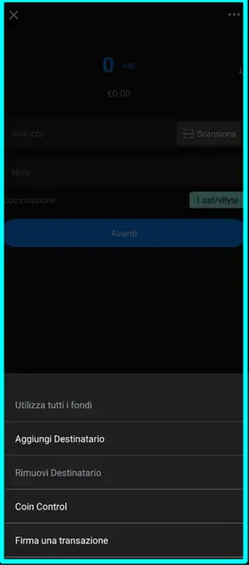 - Possibilità di firmare transazioni tramite PSBT (Partially Signed Bitcoin Transaction BIP 174), cliccando sui tre puntini in alto a destra quando si costruisce una transazione e cliccando su Firma transazione;