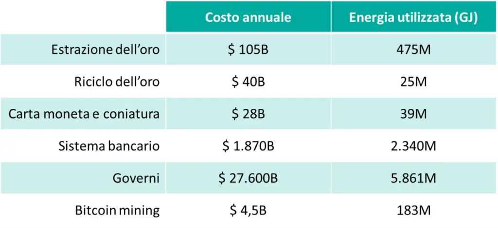 Come si vede da questa tabella, le miniere  di oro consumano più di Bitcoin, il processo di stampa e circolazione del contante costa molto più di Bitcoin. Il sistema bancario nel suo insieme consuma molto più di Bitcoin. Quindi, non è vero che Bitcoin consuma tanta energia in relazione al servizio che offre. Questa posizione spesso sottende che l’energia sia sprecata senza riconoscere il valore aggiunto della prova di lavoro.